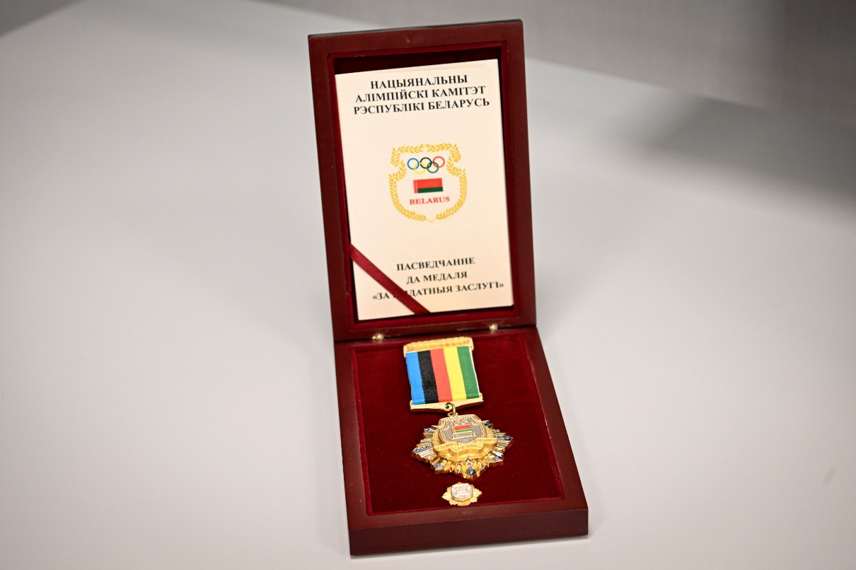 — По ходатайству Белорусской федерации баскетбола Исполкомом НОК Беларуси принято решение о награждении Вас медалью "За выдающиеся заслуги". Ваш вклад в развитие баскетбола, принципов олимпизма, популяризации здорового образа жизни — сложно переоценить. Мне очень приятно вручить Вам эту награду в Минске, в стенах олимпийского комитета Беларуси, — сказал Виктор Лукашенко.