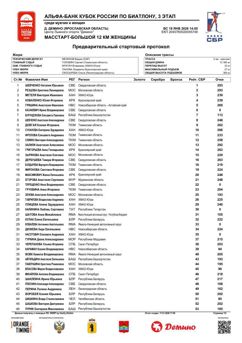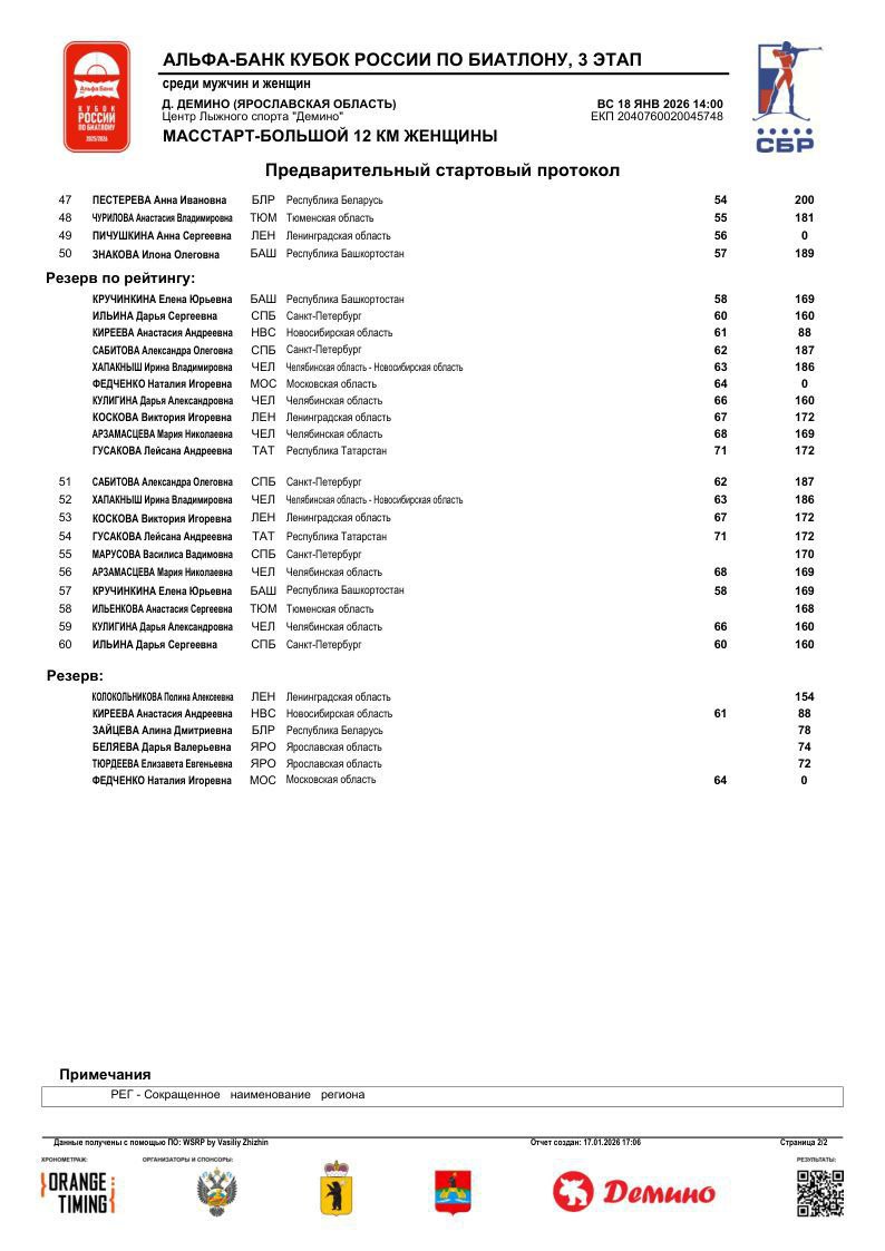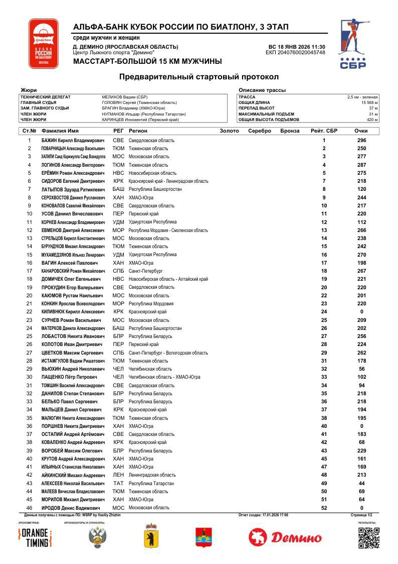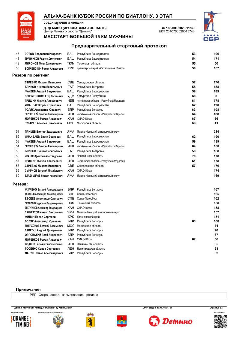 Стали известны стартовые протоколы на большой масс-старт Кубка России в Дёмино.