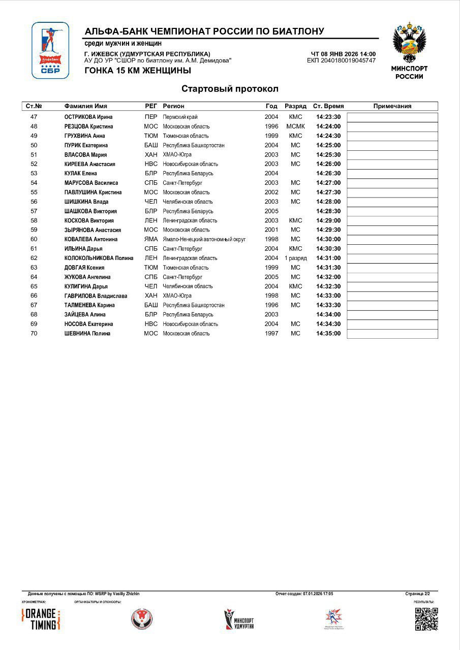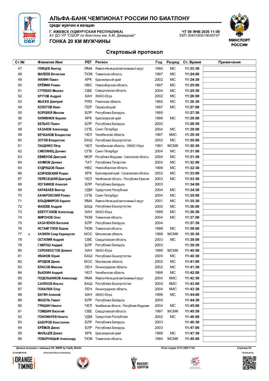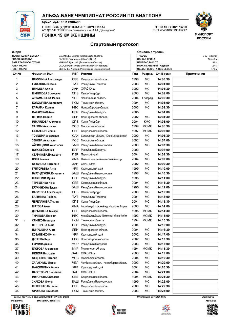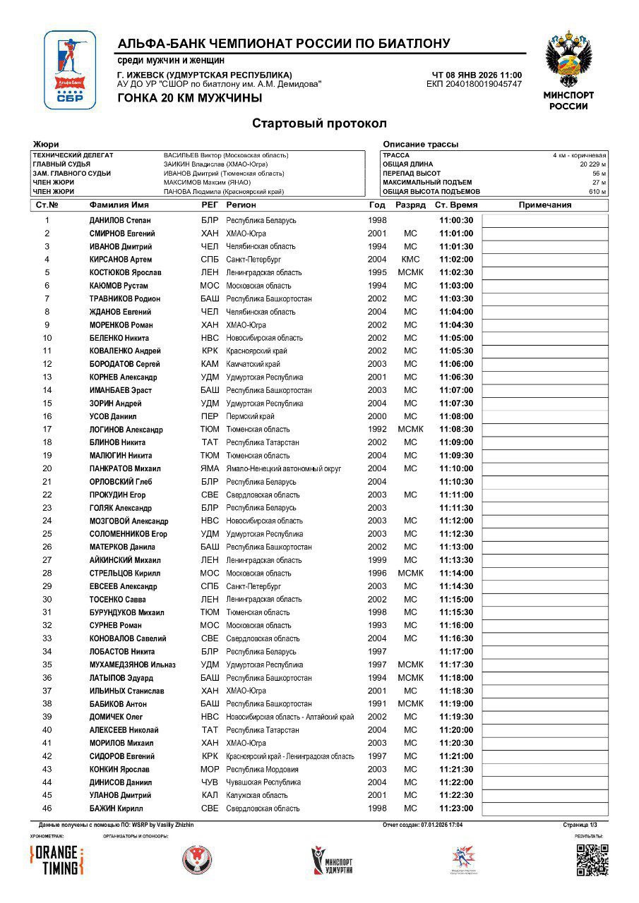 Стали известны стартовые протоколы на индивидуальные гонки чемпионата России в Ижевске.