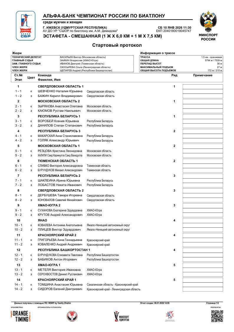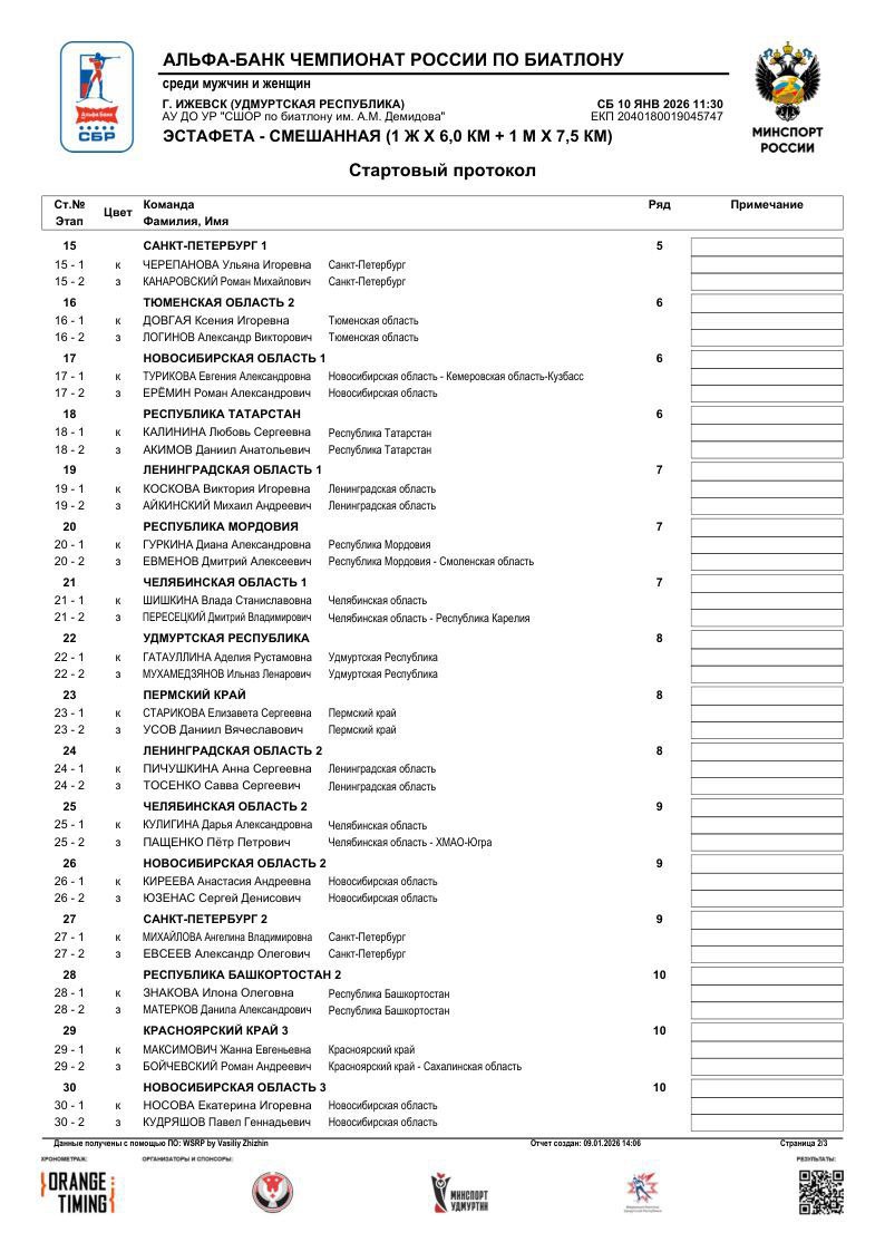 Стали известны стартовые протоколы одиночной смешанной эстафеты на этапе чемпионата России по биатлону в Ижевске.