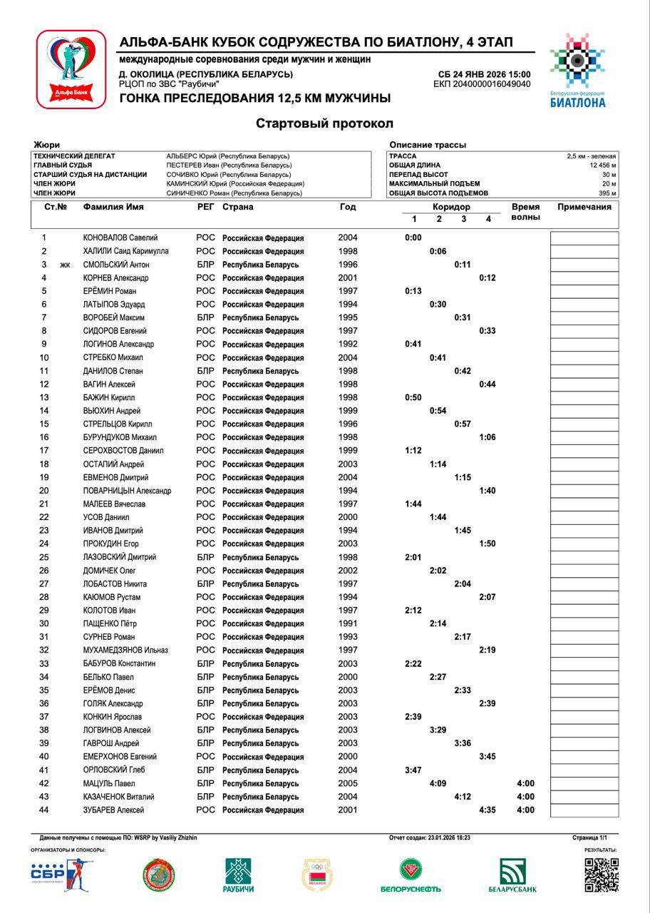 Стал известен стартовой протокол мужской гонки преследования в рамках этапа Кубка Содружества в Раубичах.