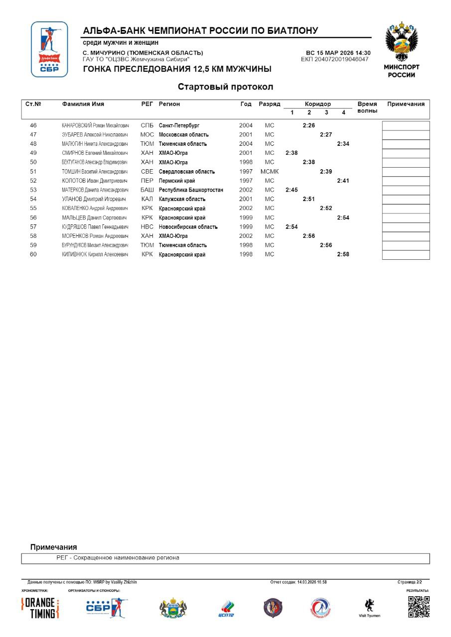 Стал известен стартовый протокол мужской гонки преследования на этапе чемпионата России по биатлону в Тюмени.