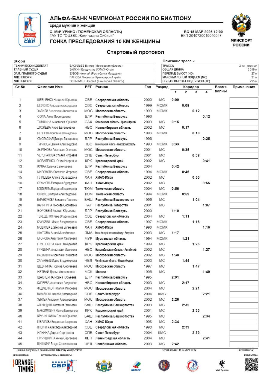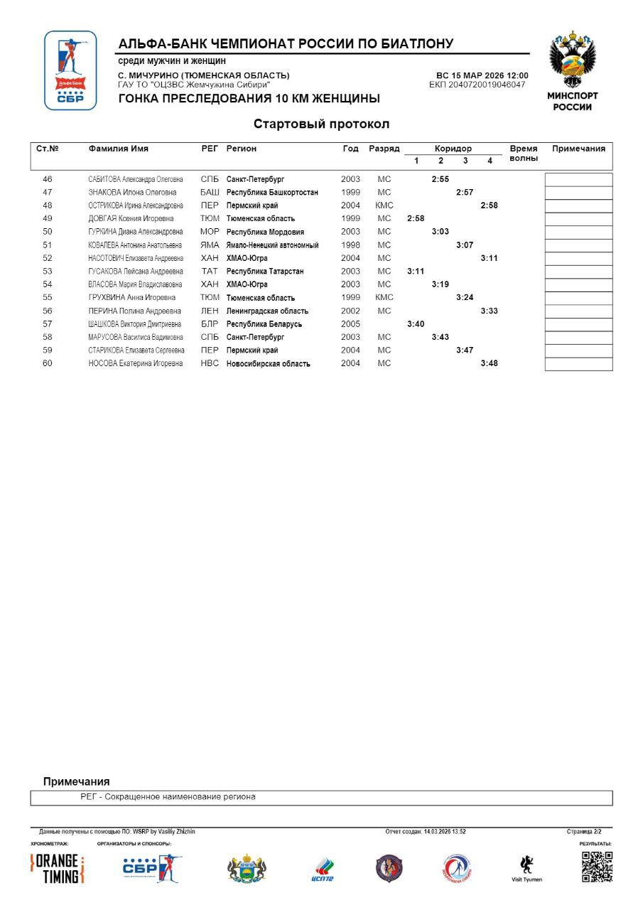 Стал известен стартовый протокол женской гонки преследования на этапе чемпионата России по биатлону в Тюмени.