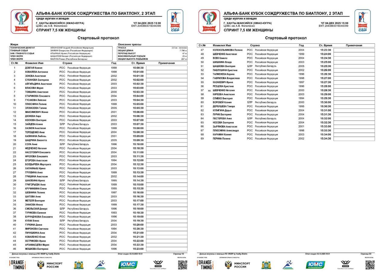 Опубликован стартовый протокол женской спринтерской гонки, которая откроет программу второго этапа Кубка Содружества по биатлону в Ханты-Мансийске.