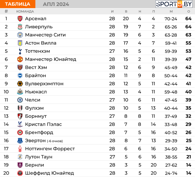 Турнирная таблица выглядит следующим образом: