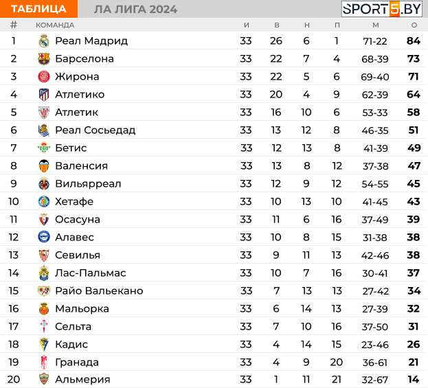 "Сливочные" с 65 очками продолжают лидировать в турнирной таблице. "Андалусийцы" с 24 баллами занимают 15-е место.