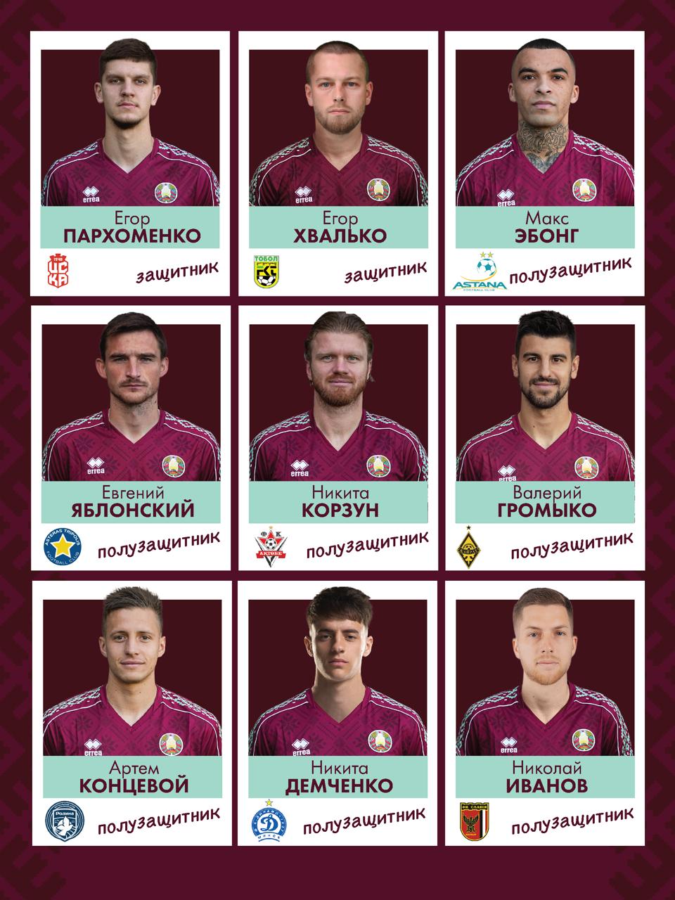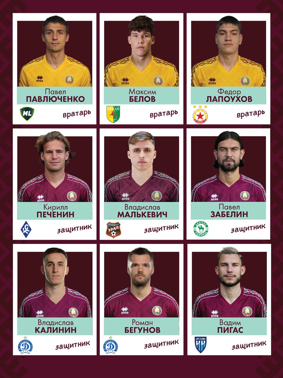 Защитники: Кирилл Печенин ("Крылья Советов", Россия), Владислав Малькевич ("Урал", Россия), Павел Забелин ("Акритас", Кипр), Владислав Калинин, Роман Бегунов (оба — "Динамо-Минск"), Вадим Пигас ("Пари НН", Россия), Егор Пархоменко (ЦСКА 1948, Болгария), Егор Хвалько ("Тобол", Казахстан).