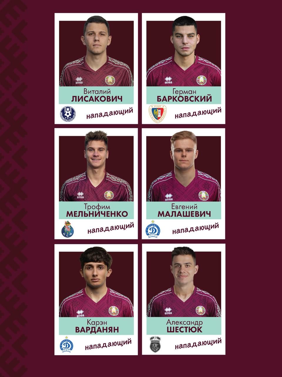 Нападающие: Виталий Лисакович ("Целе", Словения), Герман Барковский ("Пяст", Польша), Трофим Мельниченко ("Порту Б", Португалия), Евгений Малашевич, Карэн Варданян (оба — "Динамо-Минск"), Александр Шестюк ("Ислочь").