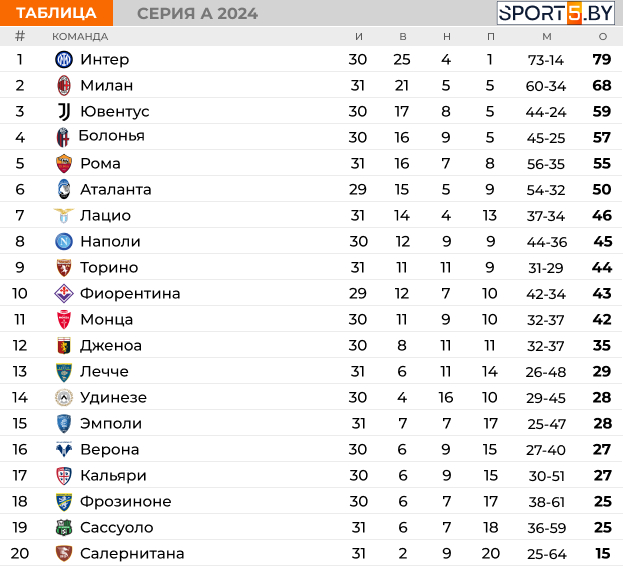 Турнирная таблица выглядит следующим образом: