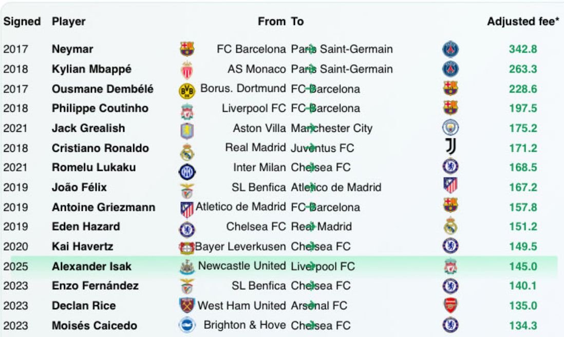 В рейтинг вошел один трансфер 2025-го года. Переход нападающего Александера Исака из "Ньюкасла" в "Ливерпуль" за € 140 млн — занимает 12-е место в рейтинге.