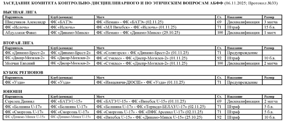 Нападающий борисовского БАТЭ Александр Шведчиков получил три матча дисквалификации, "Ислочь" оштрафована на 15 базовых величин (630 рублей), полузащитник минского "Динамо" Фаваз Абдуллахи дисквалифицирован на один матч из-за инцидента с боллбоем.