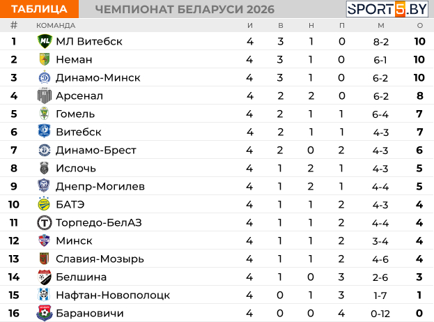 Турнирная таблица чемпионата Беларуси после 4-х туров: