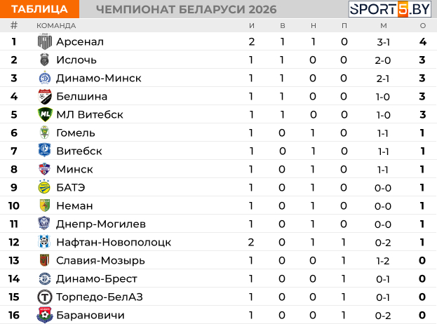 Таким образом, дзержинская команда набирает четыре очка после двух туров и временно возглавляет таблицу БВЛ. "Нафтан" остается с одним баллом.