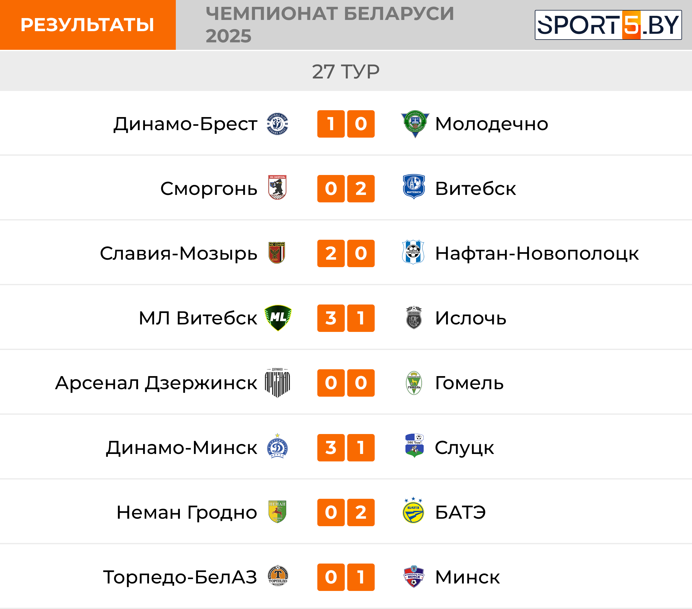 Сегодня, 2 ноября, в Высшей лиги завершился 27-й тур. Минское "Динамо" одержало победу, но не смогло приблизиться к "МЛ", "Неман" дома не справился с БАТЭ, "Витебск" и "Сморгонь" устроили шоу в "матче за выживание", а "Минск" неожиданно переиграл "Торпедо" в Жодино.