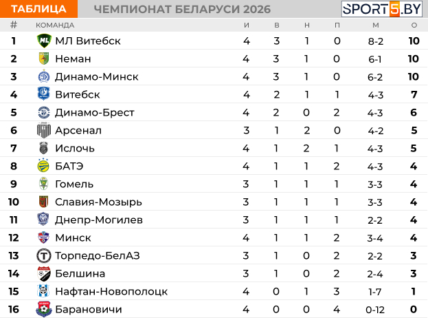 Такім чынам, МЛ даганяе "Нёман" і мінскае "Дынама". Барысаўчане застаюцца на восьмай пазіцыі.