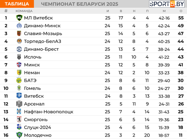 В 26-м туре с одной командой, потенциально, "вышка" может попрощаться. Если "Сморгонь" выиграет у "Минска", а "Молодечно" потеряет очки в поединке против "Арсенала", то подопечные Павла Батюто уже точно следующий сезон начнут в Первой лиге.