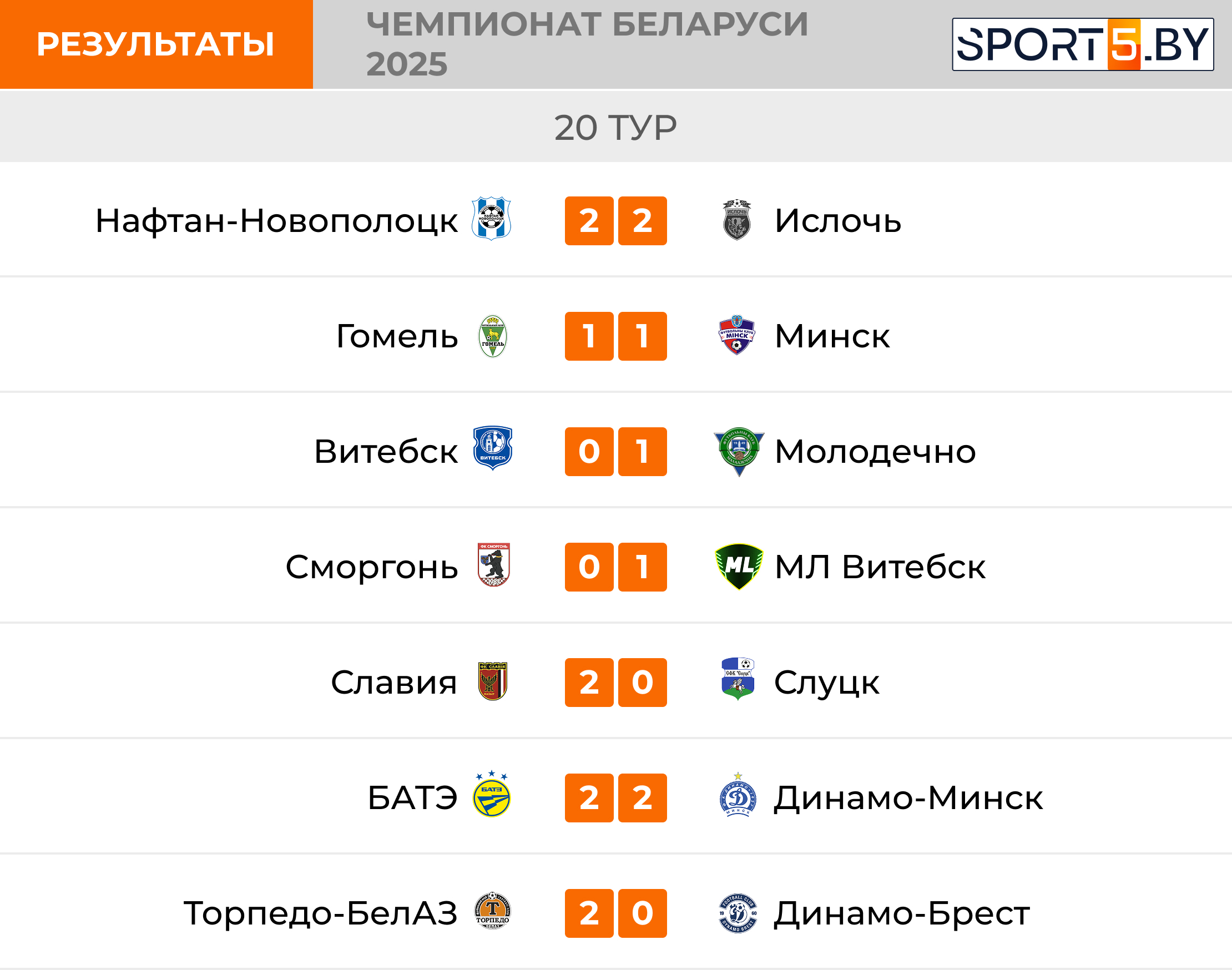В высшей лиге завершились семь матчей 20-го тура. "Молодечно" добыло вторую победу в сезоне-2025, БАТЭ и минское "Динамо" подарили жаркое "класико", а "Торпедо" оказалось сильнее брестского "Динамо".