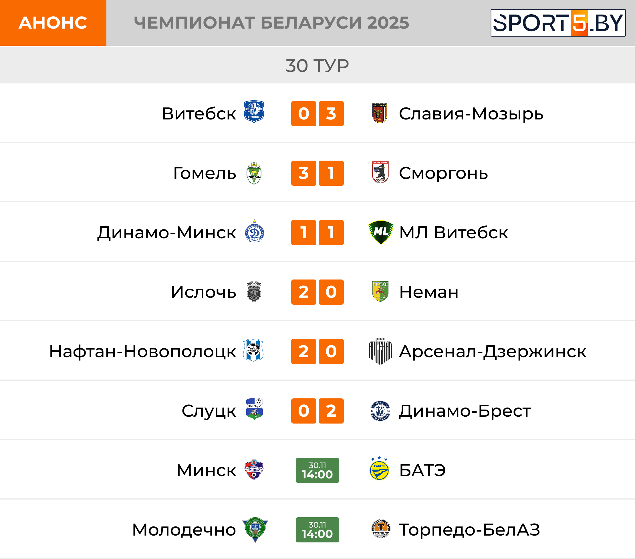 Вылетели в Первую лигу "Молодечно" и "Слуцк", а "Сморгонь" сыграет с "Белшиной" за право выступать в высшей лиге в следующем сезоне.