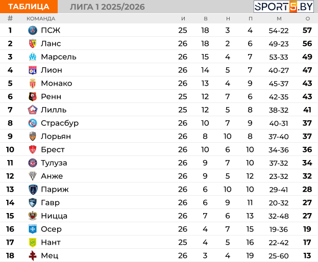 Таблица Лиги 1 на данный момент:
