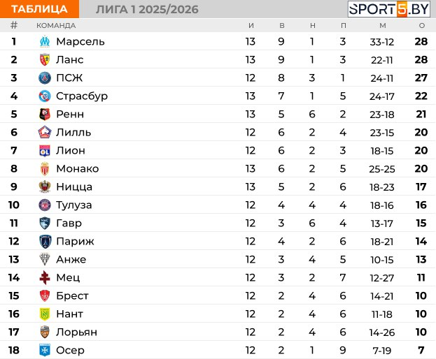 Турнирная таблица французской Лиги 1 на данный момент выглядит следующим образом: