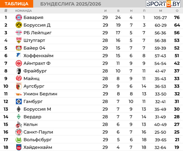 Турнирная таблица Бундеслиги на данный момент выглядит следующим образом: