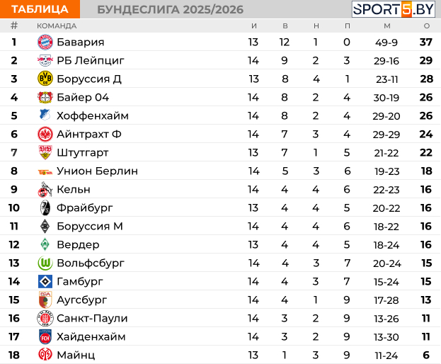 Таблица Бундеслиги на данный момент: