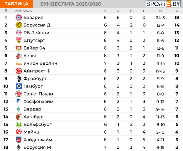 Турнирная таблица Бундеслиги на данный момент выглядит следующим образом: