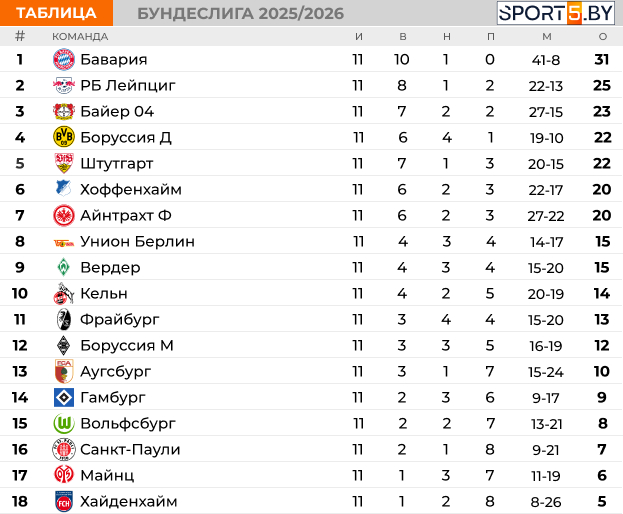 Сегодня, 23 ноября, в Бундеслиге завершился 11-й тур.