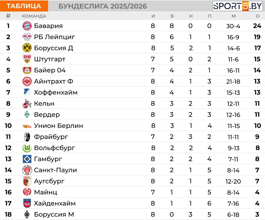 Таблица Бундеслиги на данный момент: