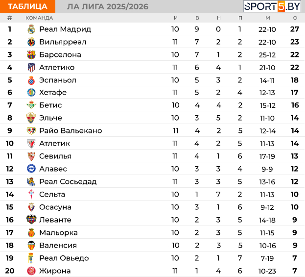 В Испании продолжается 11-й тур. "Атлетико" сравнивается по очкам с "Барселоной", "Реал Сосьедад" вырывает победу на последних секундах, "Вильярреал" поднимается на вторую строчку.