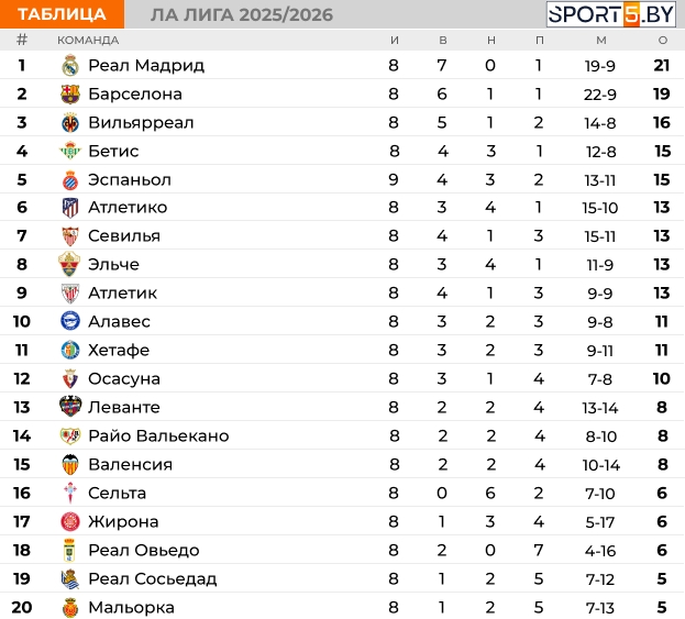Турнирная таблица испанской Ла Лиги на данный момент выглядит следующим образом: