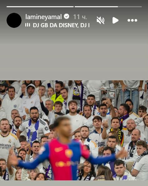 Нападающий "Барселоны" Ламин Ямаль в аккаунте в социальной сети опубликовал свою размытую фотографию с разведёнными руками на фоне разгневанных болельщиков мадридского "Реала".