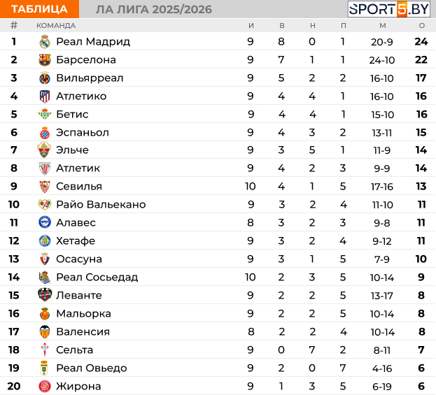 Лидирует в таблице чемпионата Испании "Реал". В спину дышит "Барселона". Остальные позади на пять очков.