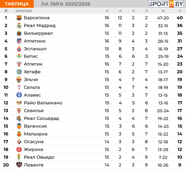 Турнирная таблица чемпионата Испании на данный момент выглядит следующим образом: