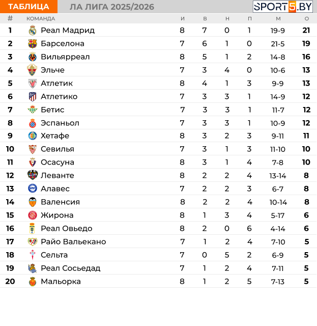 Турнирная таблица чемпионата Испании на данный момент: