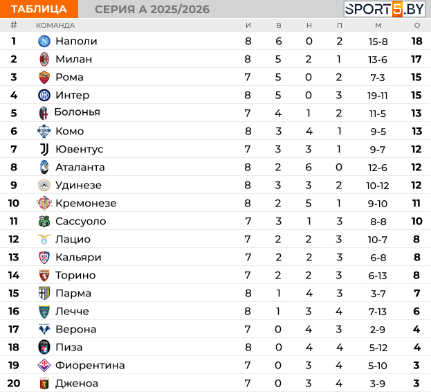 Турнирная таблица Серии А на данный момент выглядит следующим образом: