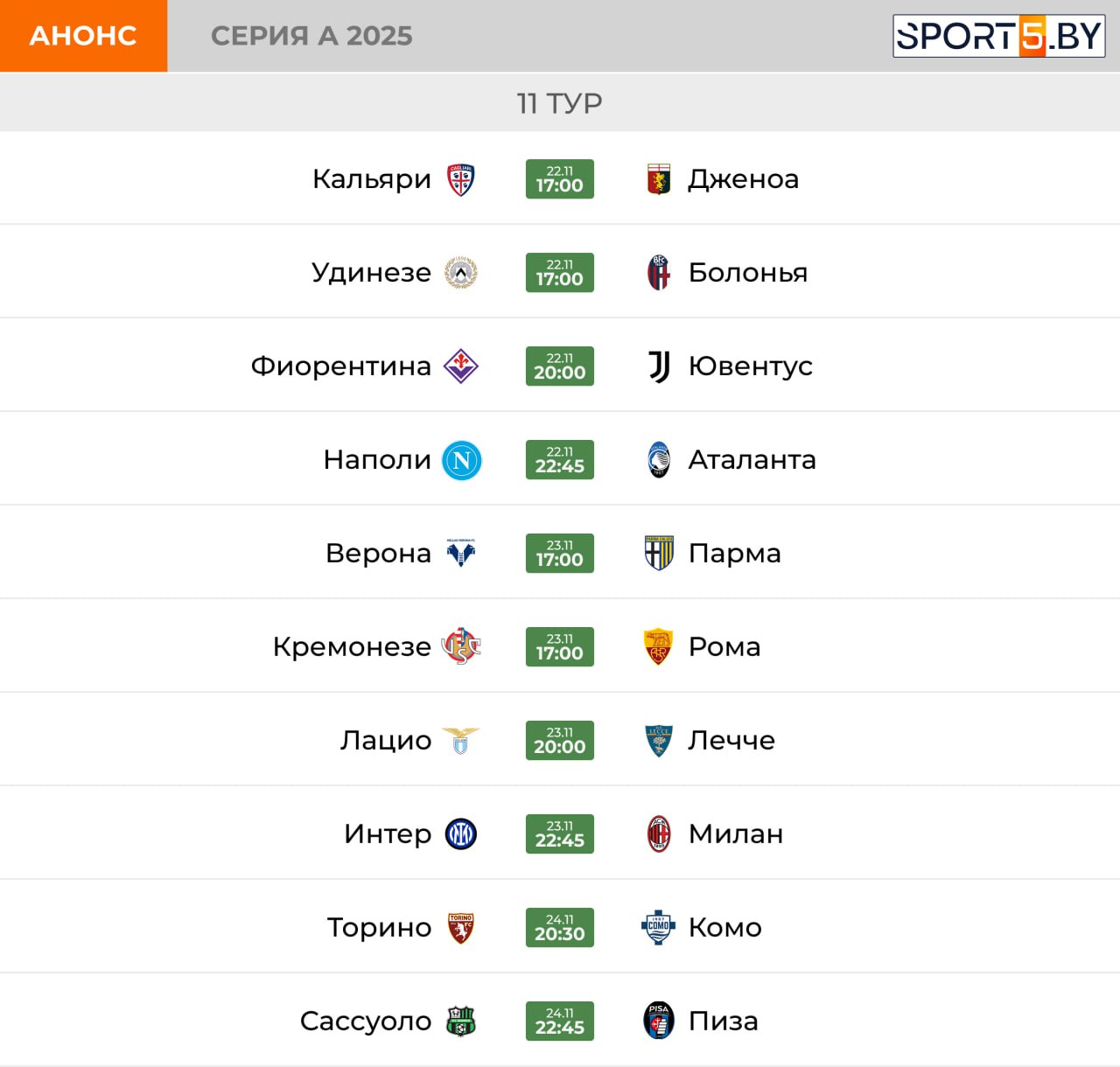 Полное расписание тура Серии А:
