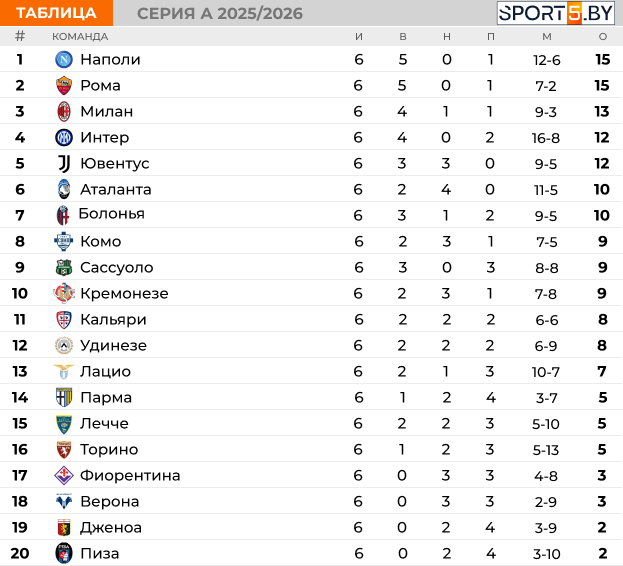 Сегодня, 5 октября, состоялось пять матчей заключительного игрового дня 6-го тура Серии А.