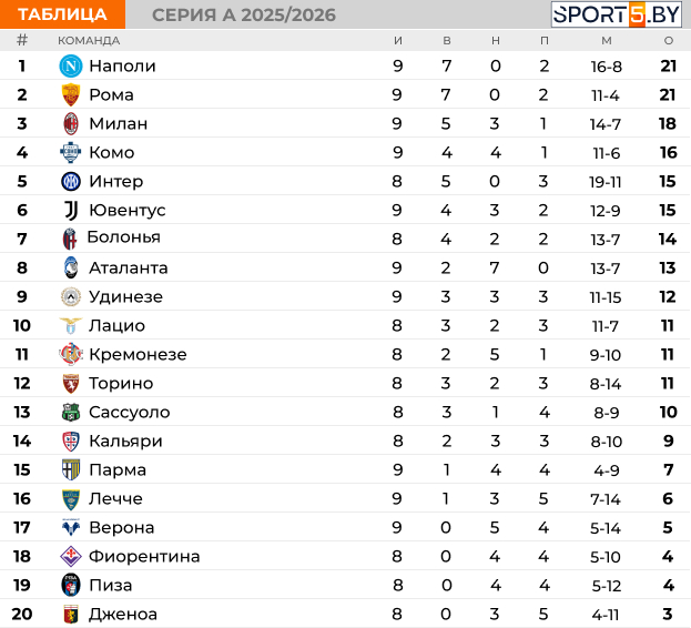 Также сегодня проходят три поединка: "Болонья" — "Торино", "Дженоа" — "Кремонезе", "Интер" — "Фиорентина".