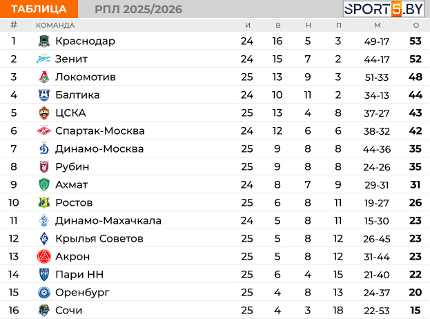 Таблица РПЛ на данный момент:
