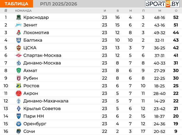 Таблица РПЛ: