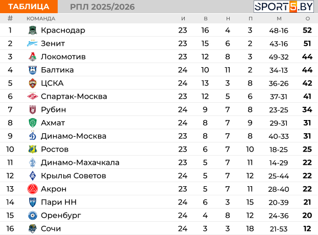 Турнирная таблица РПЛ на данный момент выглядит следующим образом: