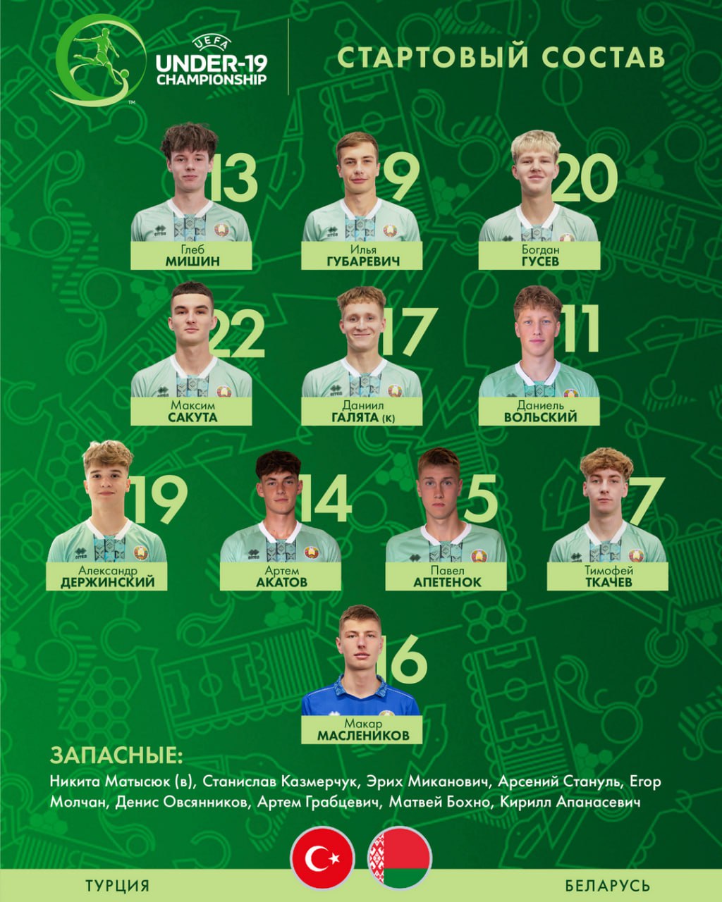 Беларусь U-19: Маслеников — Акатов, Апетенок, Держинcкий, Ткачев, Гусев, Галята (к), Сакута, Мишин, Губаревич, Вольский.