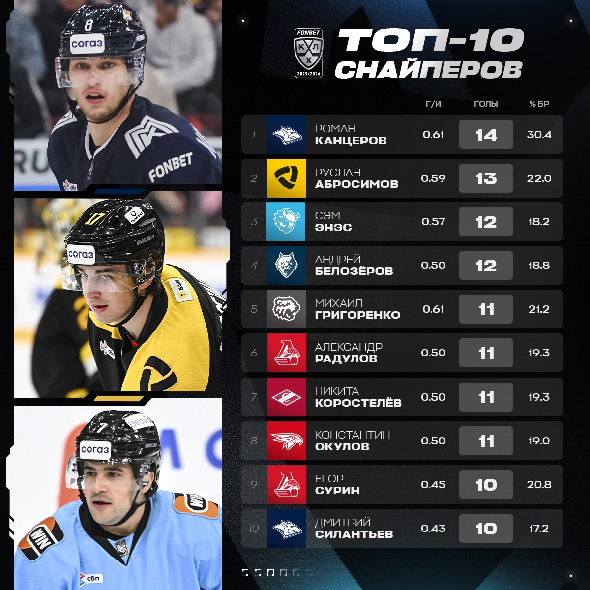 Лидером топ-10 стал Роман Канцеров из "Металлурга": нападающий отличился 14 раз (0,61 гола за матч) с впечатляющей эффективностью бросков — 30,4%.