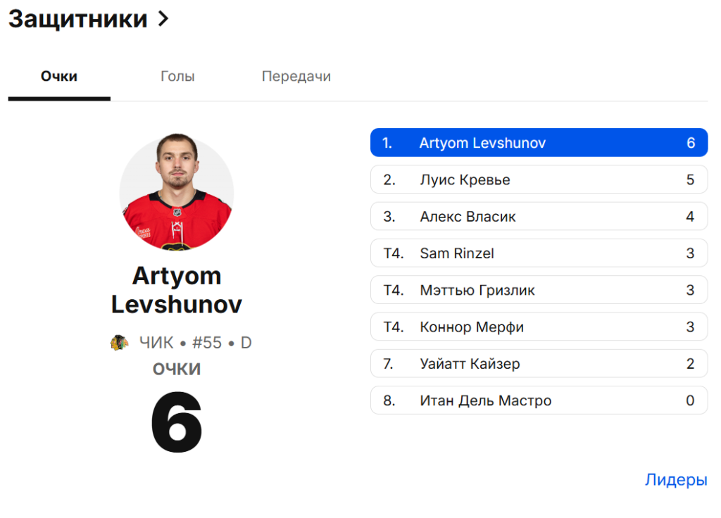 Прямо сейчас, с 6-ю набранными очками Левшунов является лучшим бомбардиром-защитником своей команды.