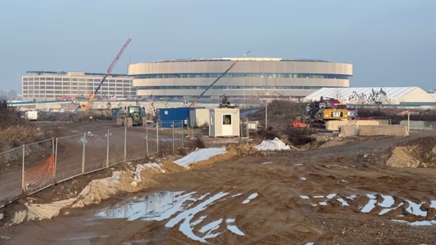 Территория вокруг объекта пустует из-за споров о грунтовых водах, граничит с незавершёнными дорогами и заросшими свалками строительного мусора.
