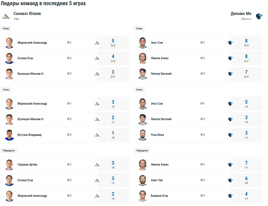 У минского "Динамо" сразу трое хоккеистов набирают очки в четырёх матчах подряд: Сэм Энас (5+3), Виталий Пинчук (3+4) и Алекс Лимож (1+7). Энас вышел на вторую позицию среди бомбардиров и снайперов регулярки (22+22 в 38 матчах).