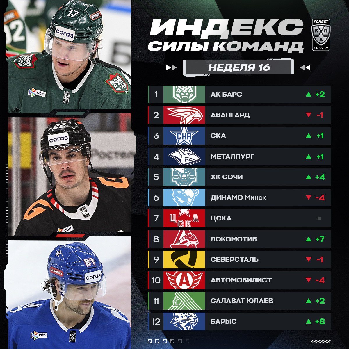 Официальный сайт лиги опубликовал обновленный рейтинг после 16-й недели.