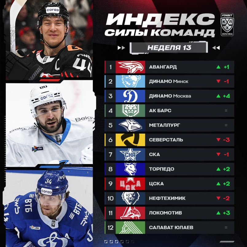Континентальная хоккейная лига опубликовала обновлённый Индекс силы по результатам 13-й игровой недели регулярного чемпионата.