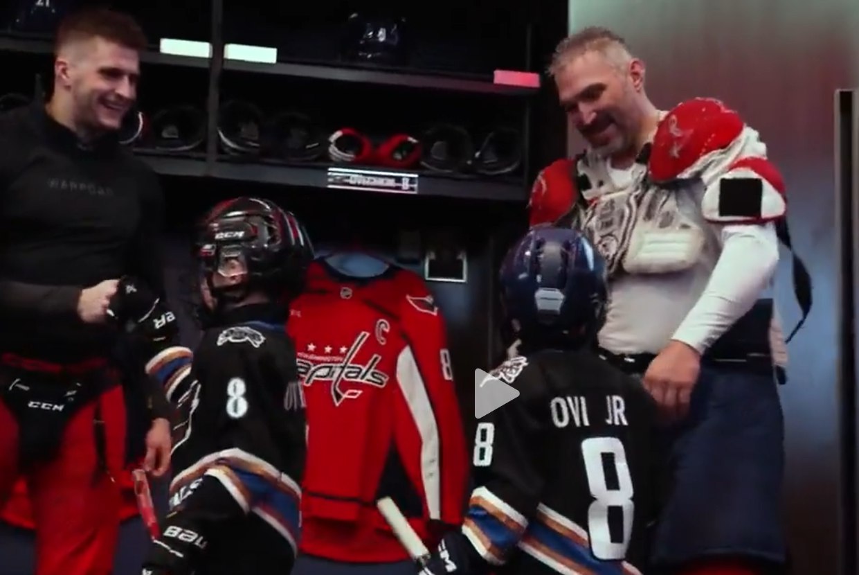 Российский нападающий "Вашингтон Кэпиталз" Александр Овечкин с двумя сыновьями зашёл в раздевалку столичного клуба, где детей встретили овациями хоккеисты команды.